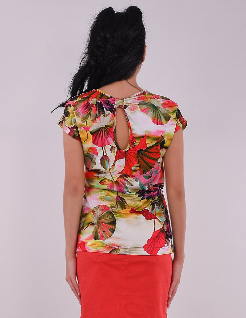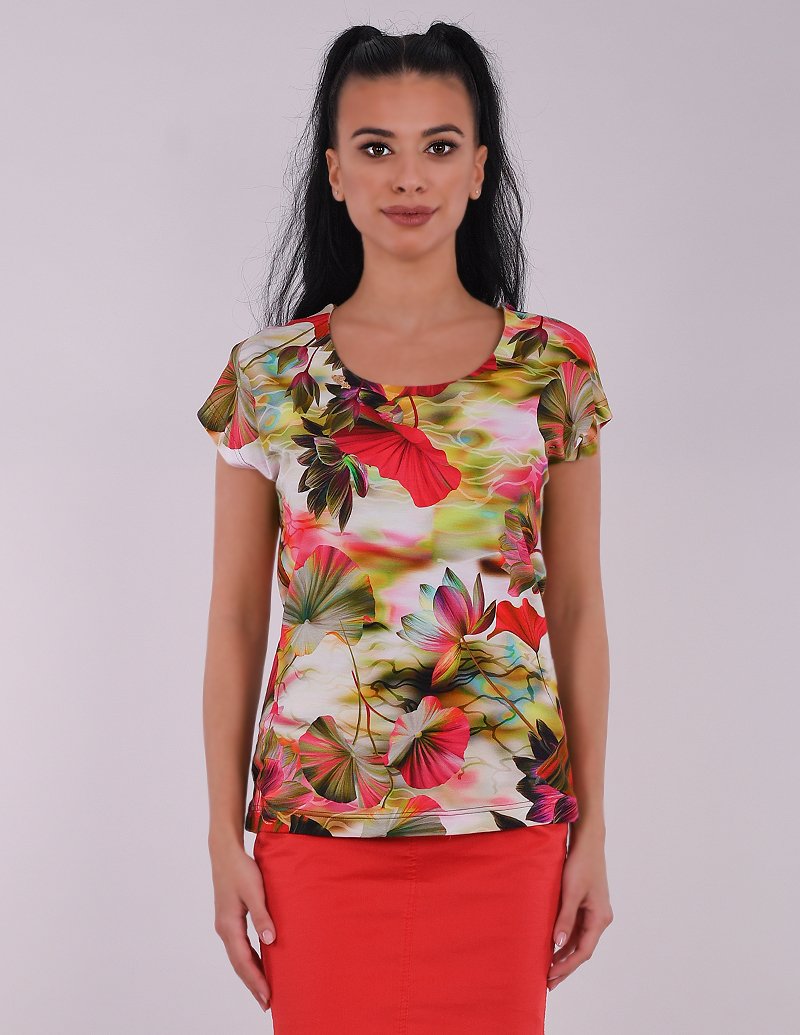 Нежна блузка от фино вискозно трико в разкошна експлозия от наситени цветове.. Права кройка с паднало рамо и нежен капковиден акцент на гърба. Блуза КЛЕР е винаги добър избор, с който ще се чувствате стилно и удобно, а цветната композиция позволява множество вариианти за съчетания.