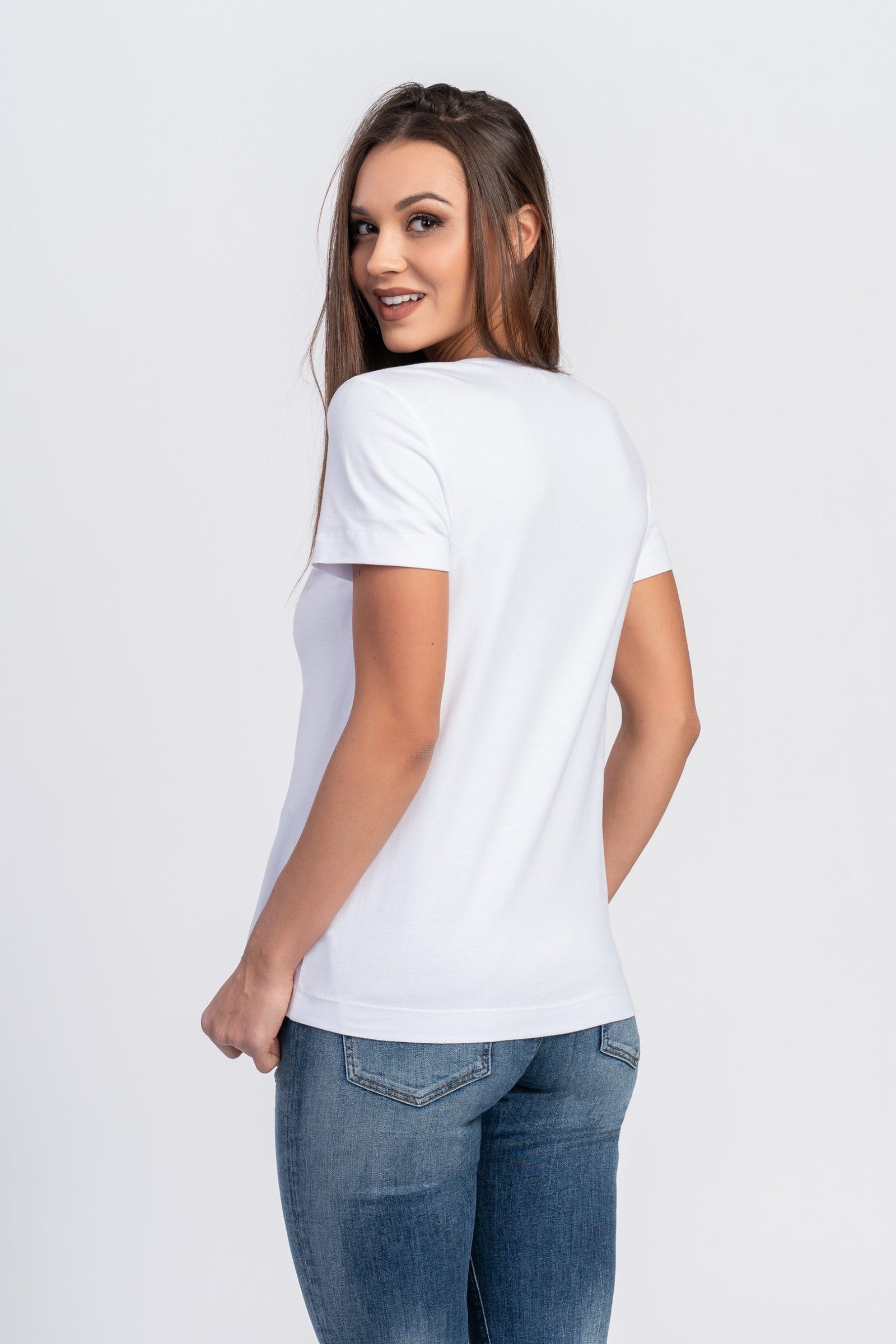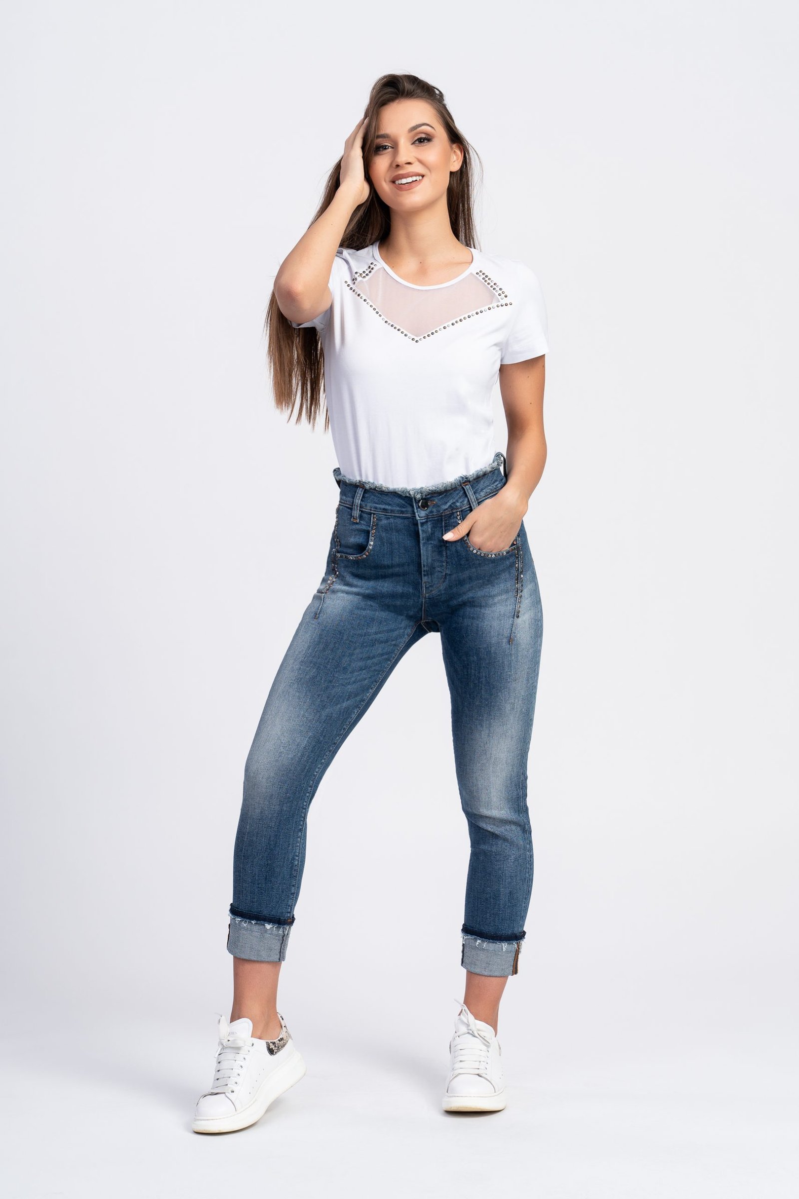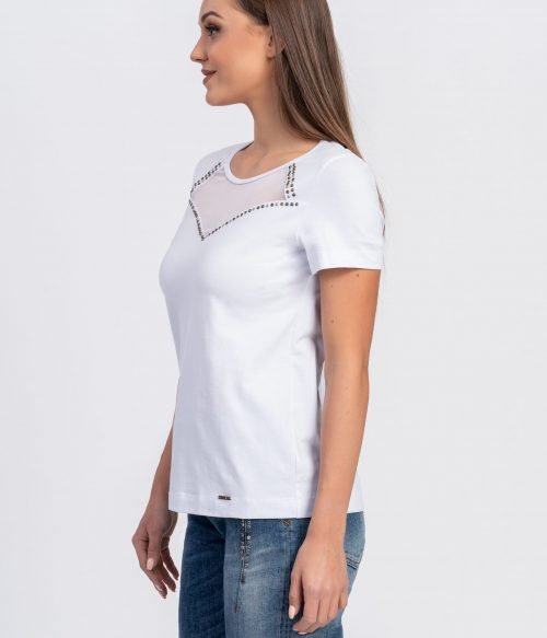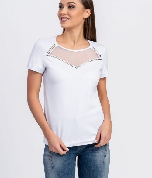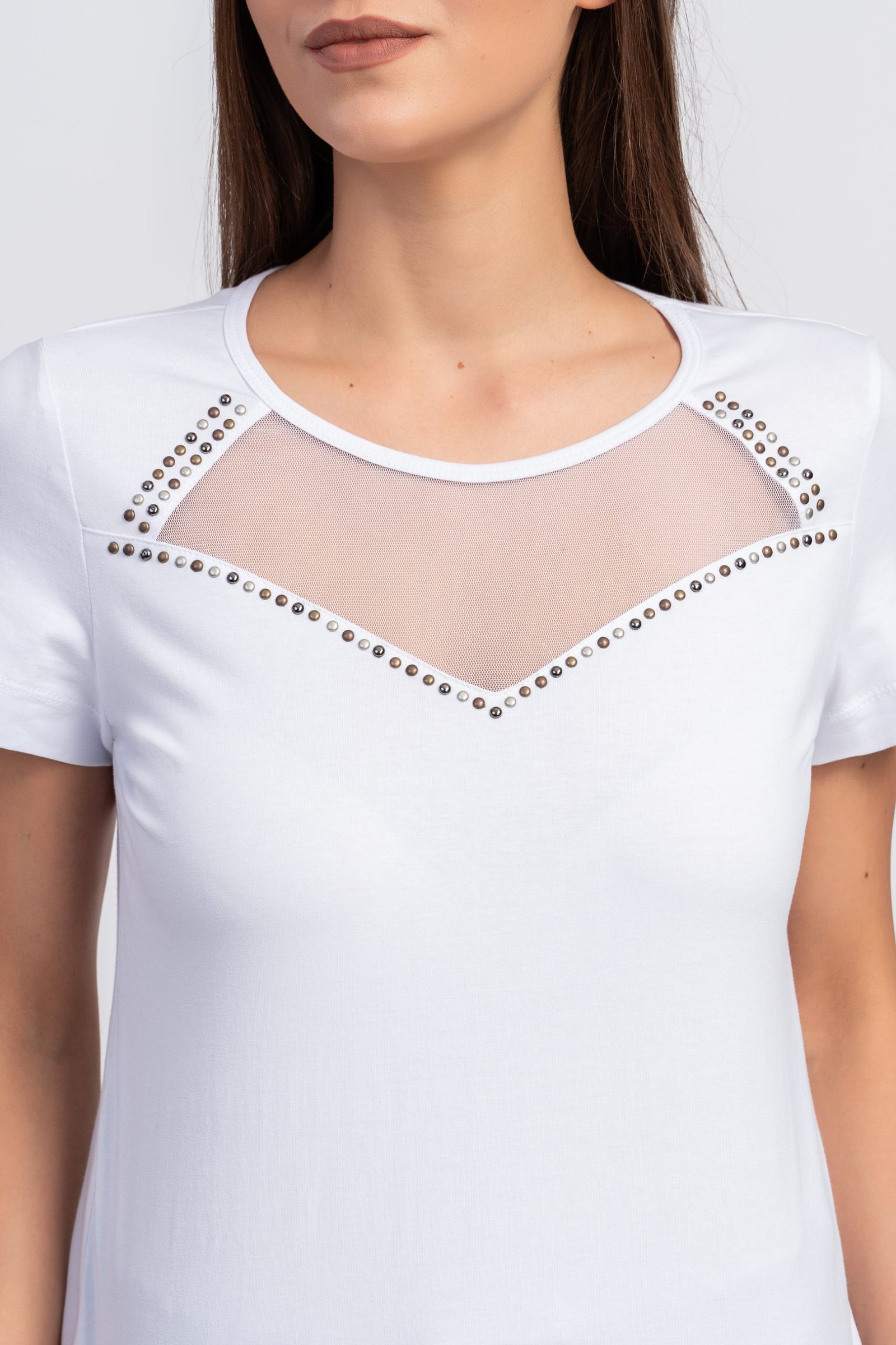 Блуза с къс ръкав, декорация тюл и капси на деколтето