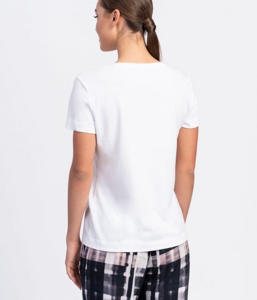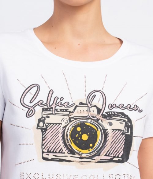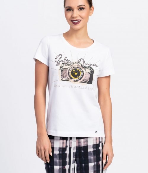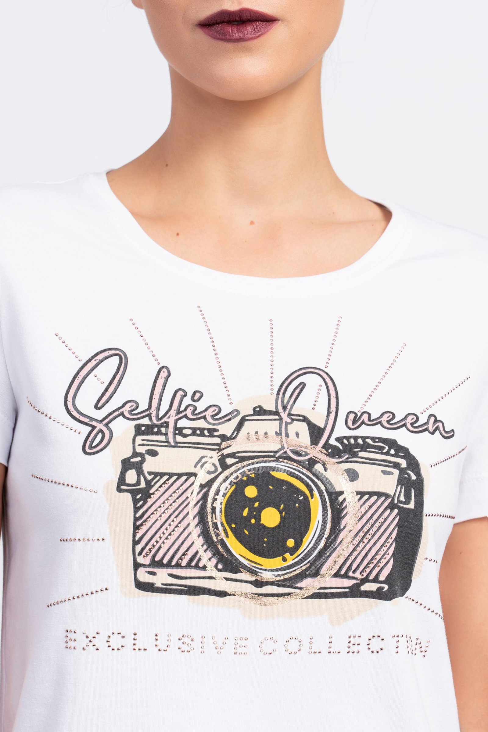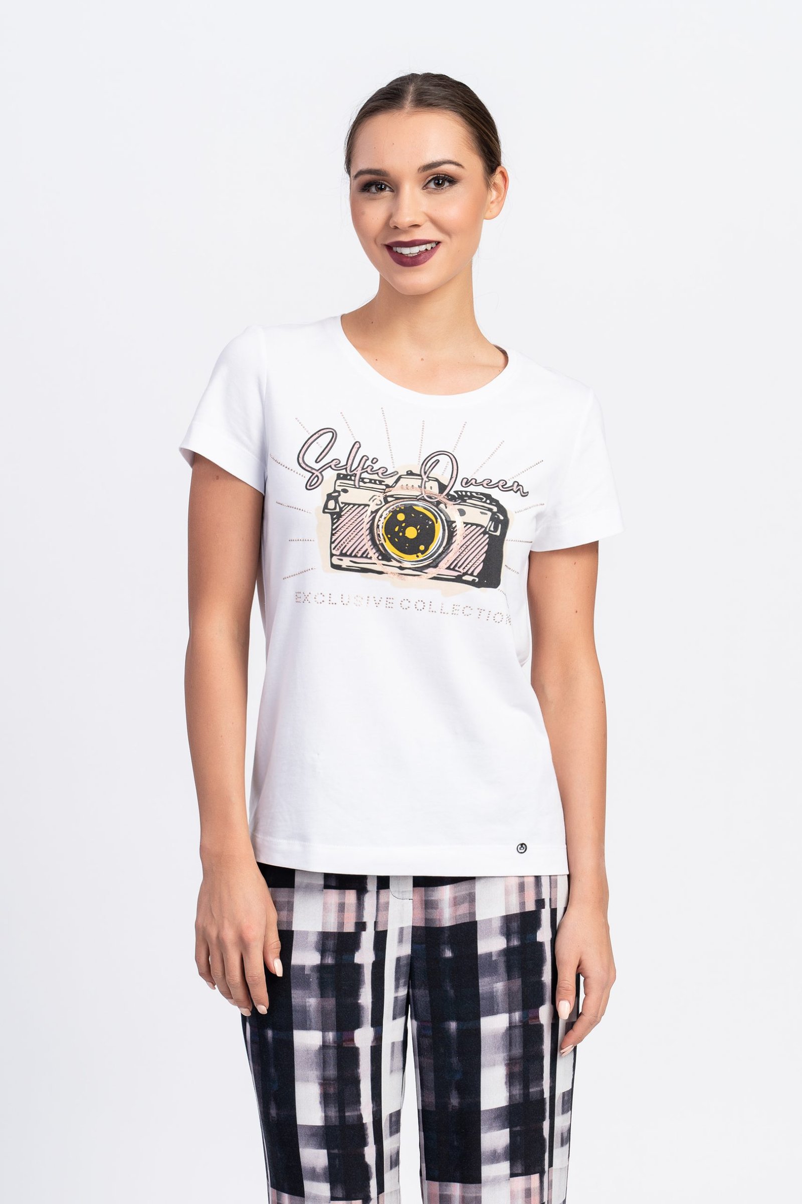 Блуза с къс ръкав от трико памук с проект щампа и камъни.