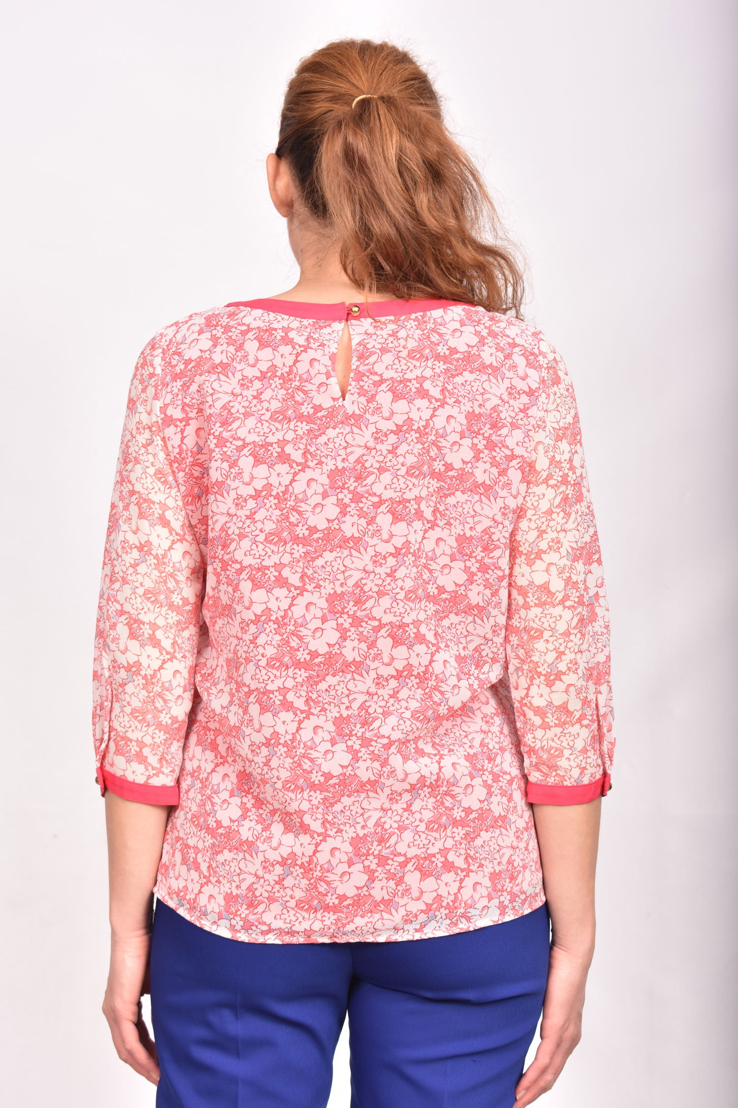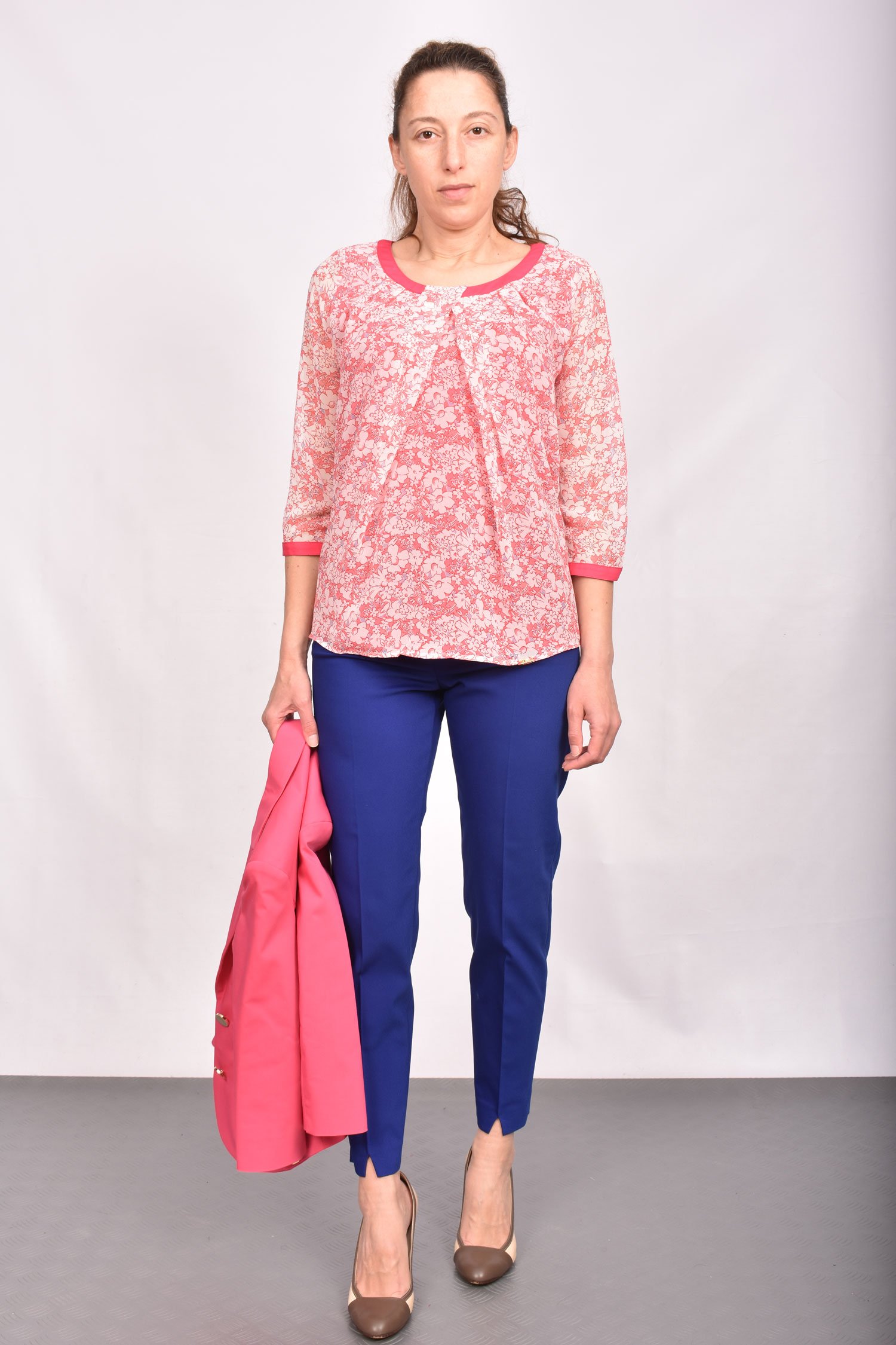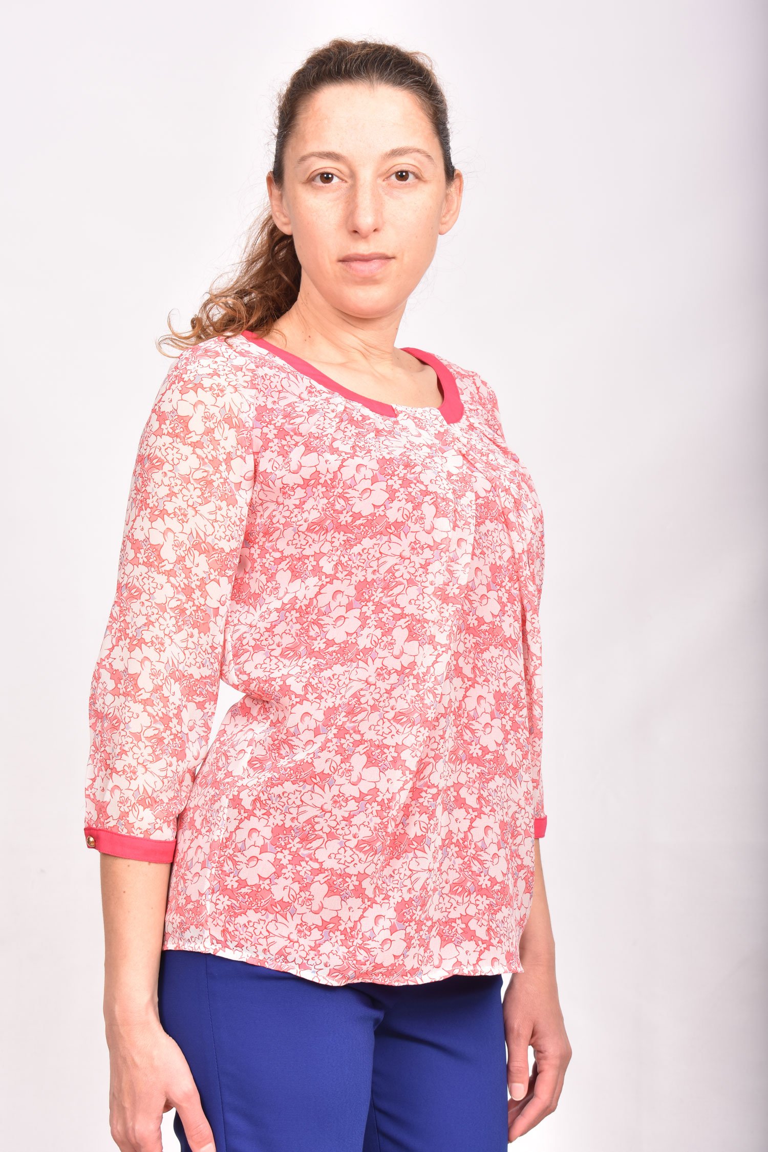 Свободна блуза с фалти и вискозна гарнитура в тон с десена. Моделът е спортно елегантен и може да се носи също като външна блуза.
