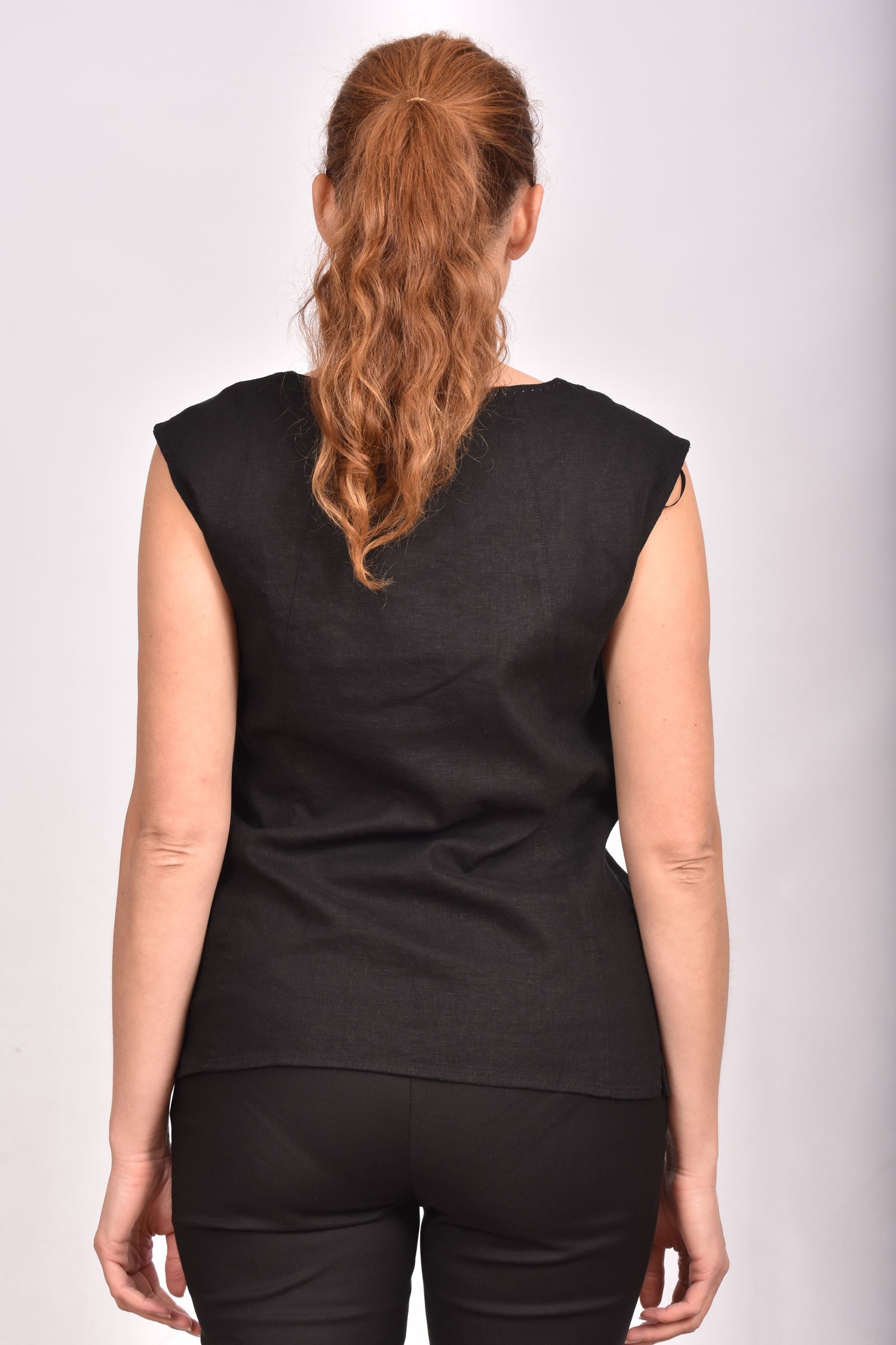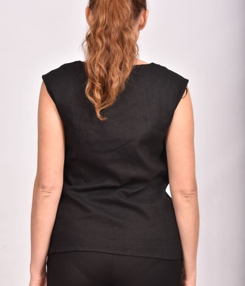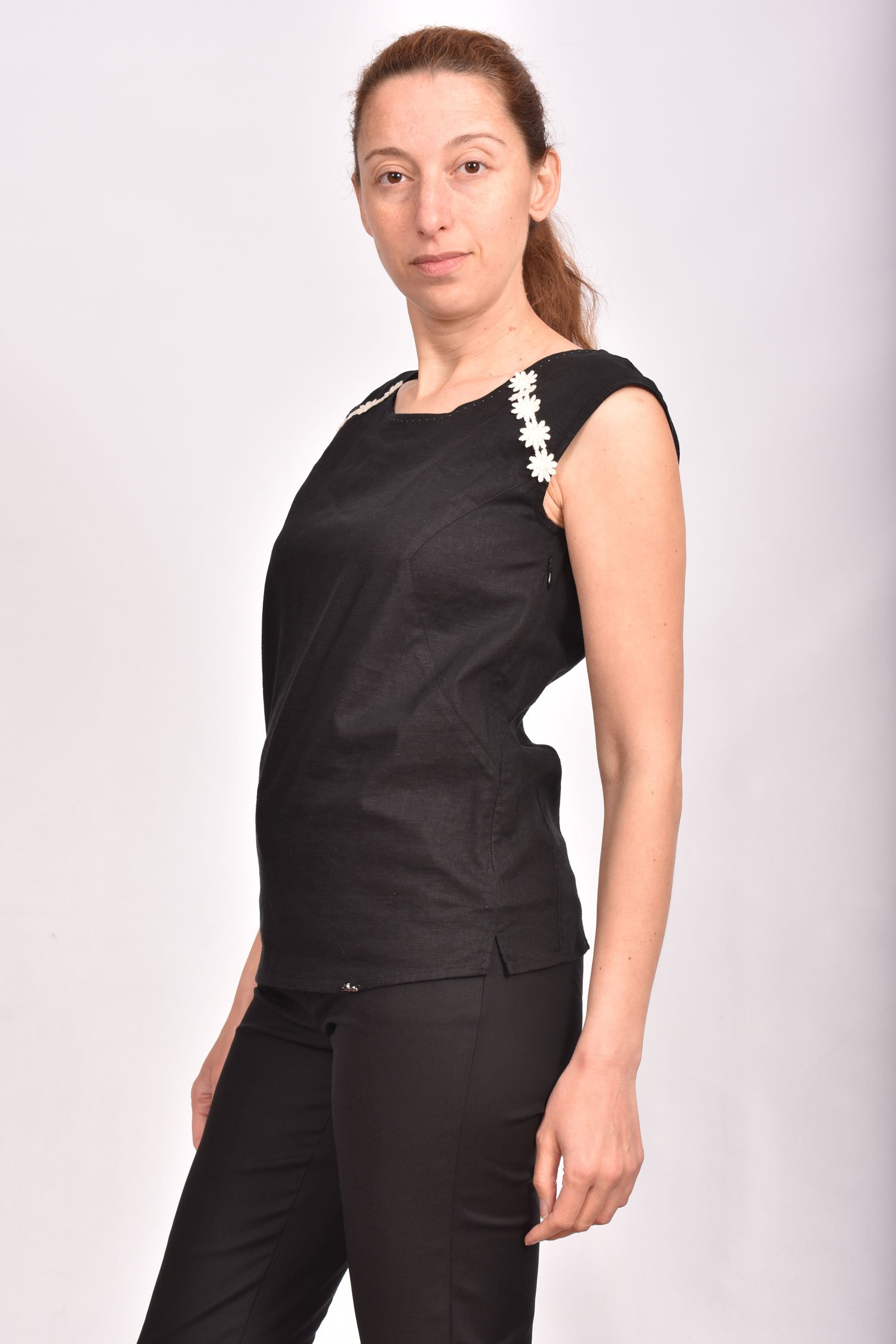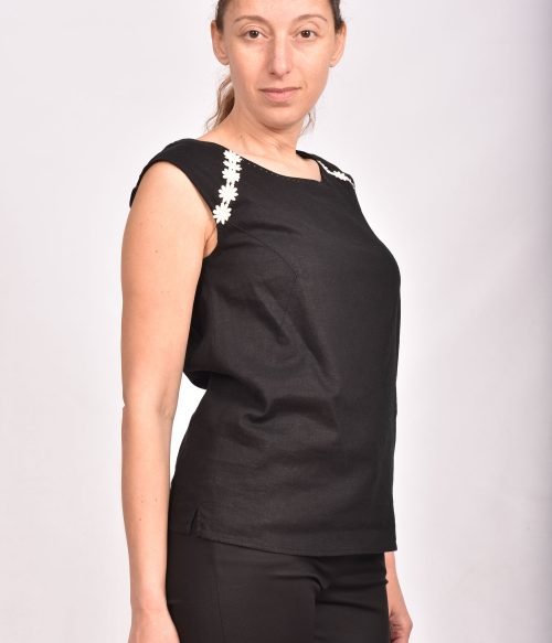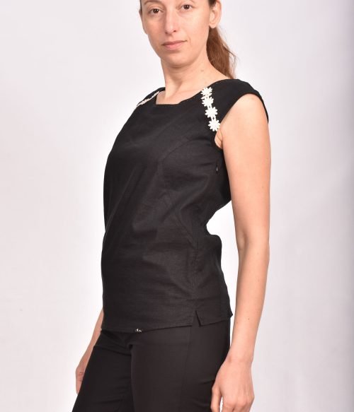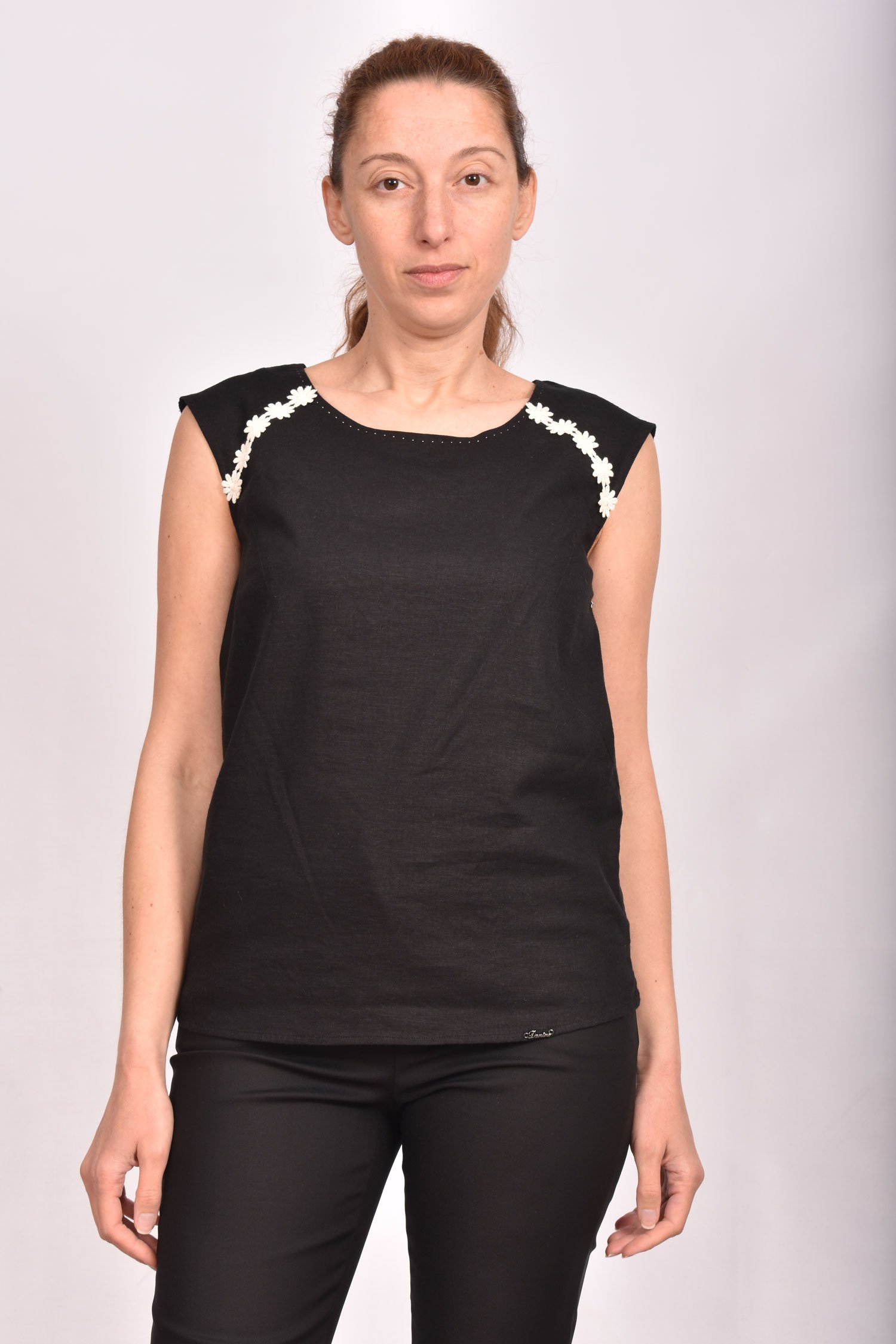 Ленен прав освободен топ с гарнитура дантела по раменете.