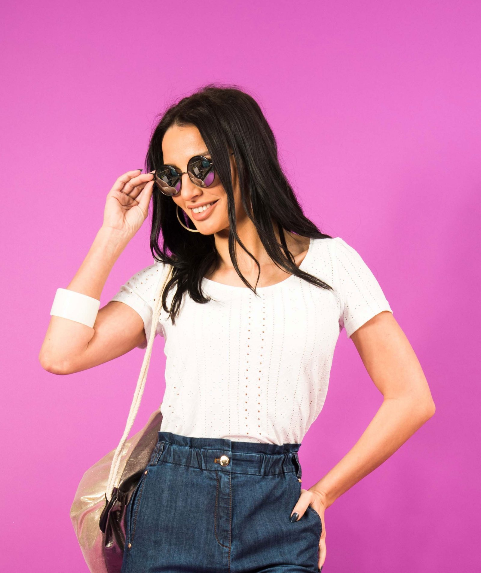 Трикотажна блуза с принт на гърба върху фина мрежа, налична е и в цвят охра.