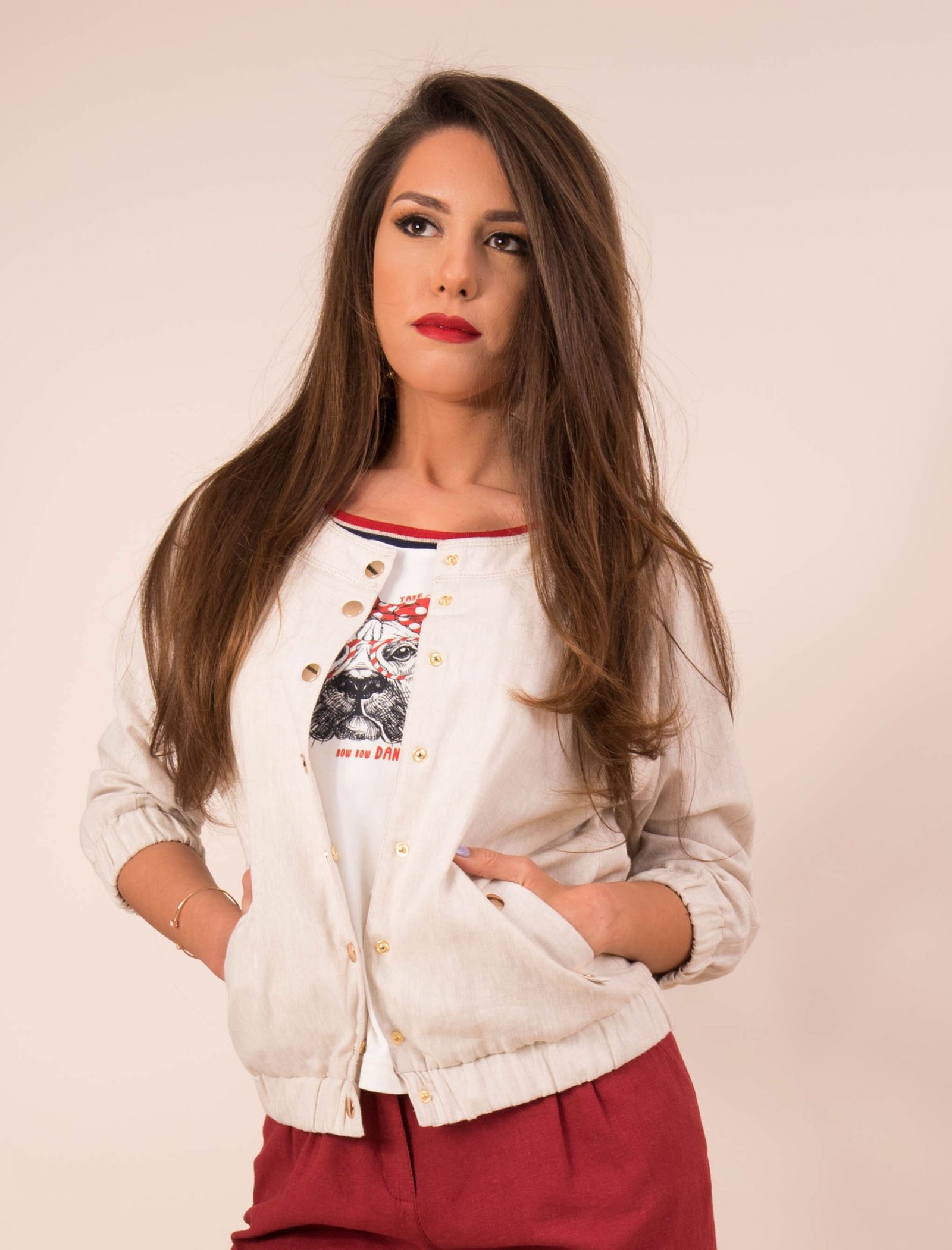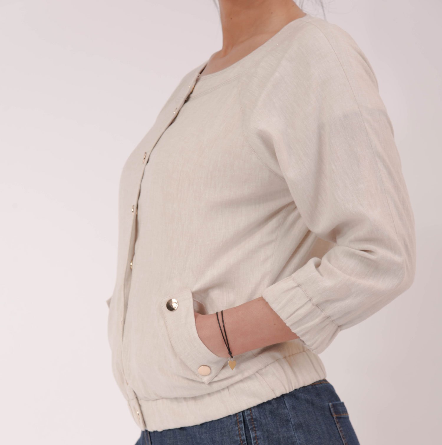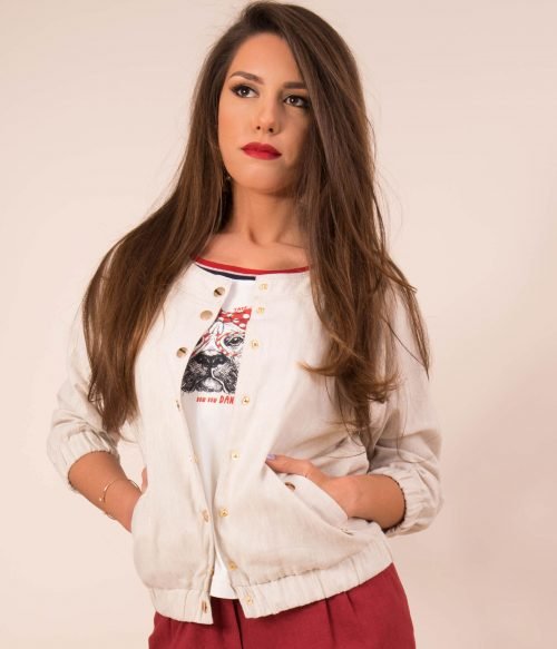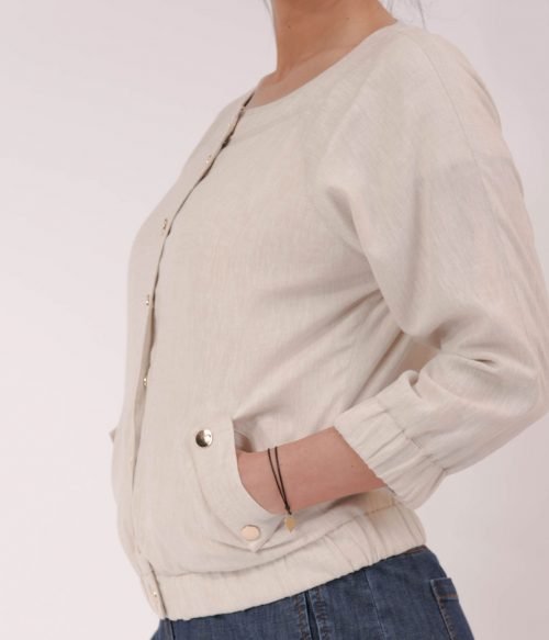 Модерно, бомбър ленено яке с 3/4 ръкав , ластик на ръкавите и тялото. Закопчаването е с тик-так копчета в цвят злато.