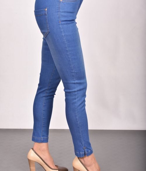 Денимен панталон с изтривания в океанско син цвят. Моделът е с пет джоба и леки и дисктретни цепки долу по крачола