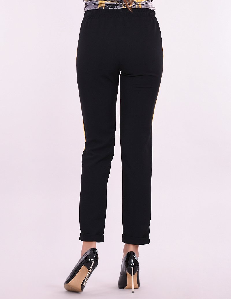 Спортно – елегантен панталон от невероятно лека и комфортна материя, подходящ за летния сезон. Свободна линия на крачолите, контрастен кант в симпатичен жълт цвят. Панталана е с вгадена ластична лента и допълнителна жълта вързанка, която е цветен акцент. Благодарения на бохемската линия на панталон ЙОАНА може да го съчетаете с блузи и тениски от последната ни колекция.