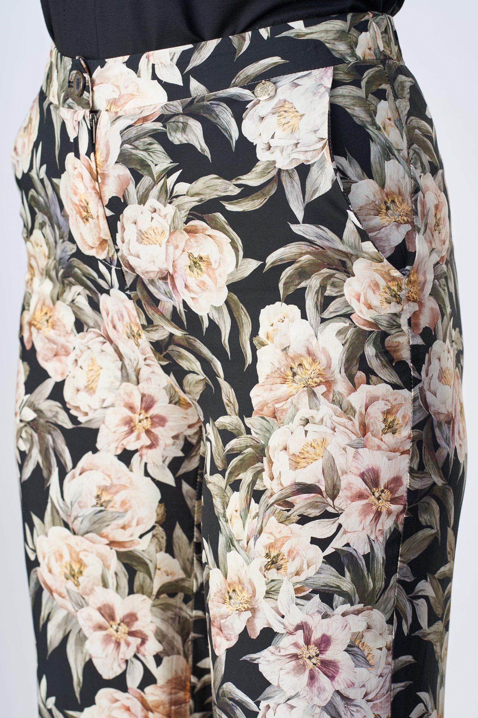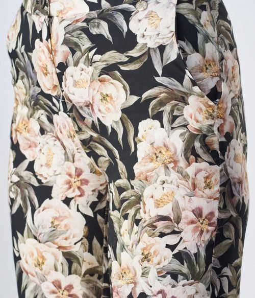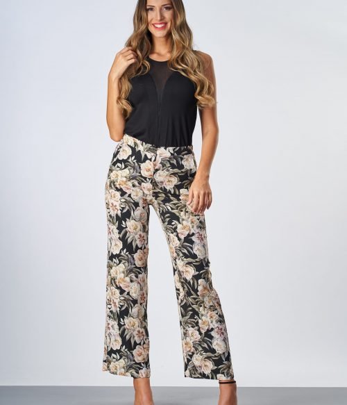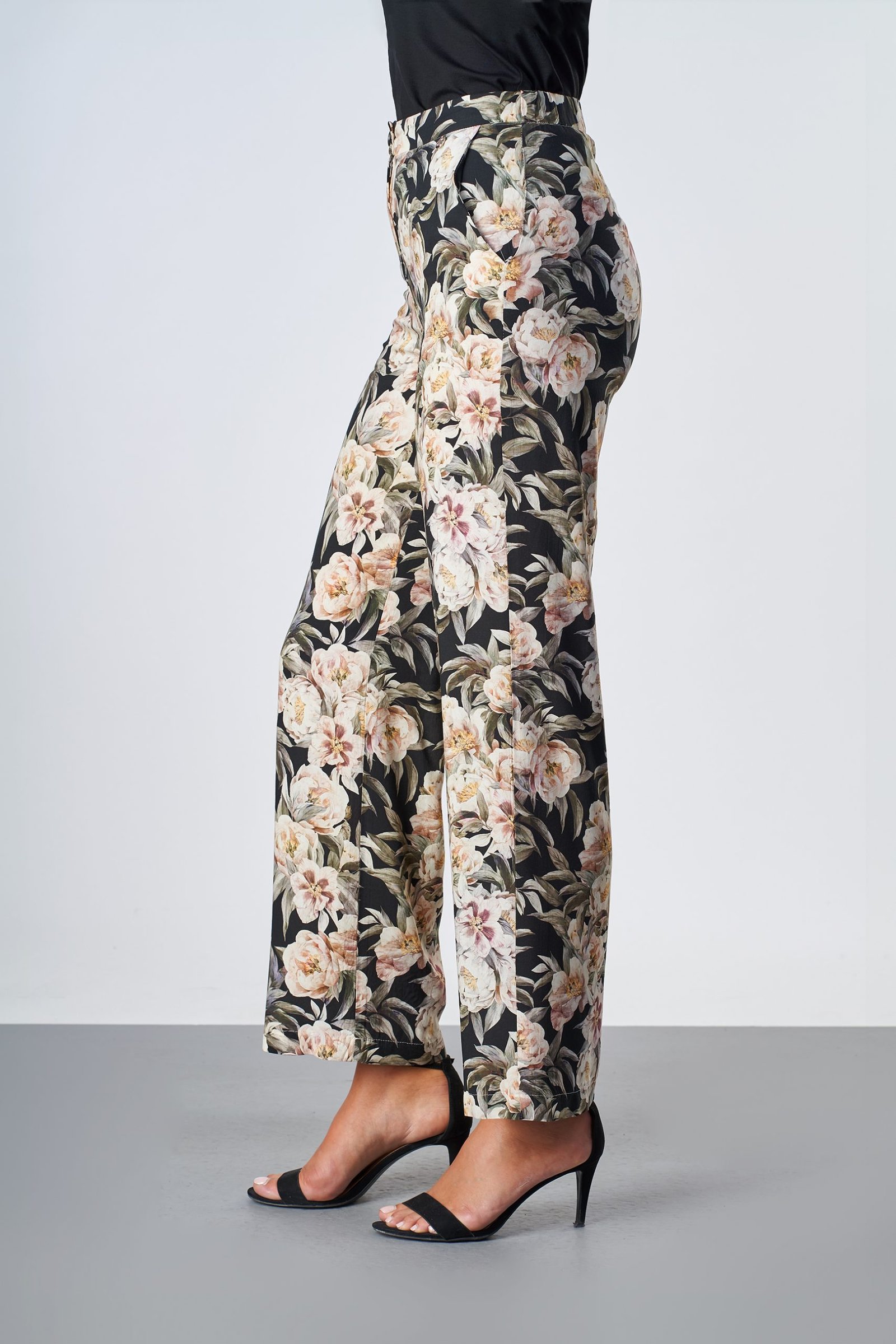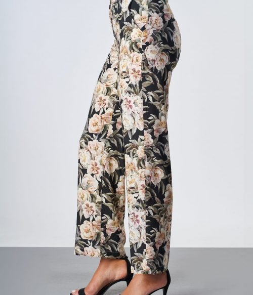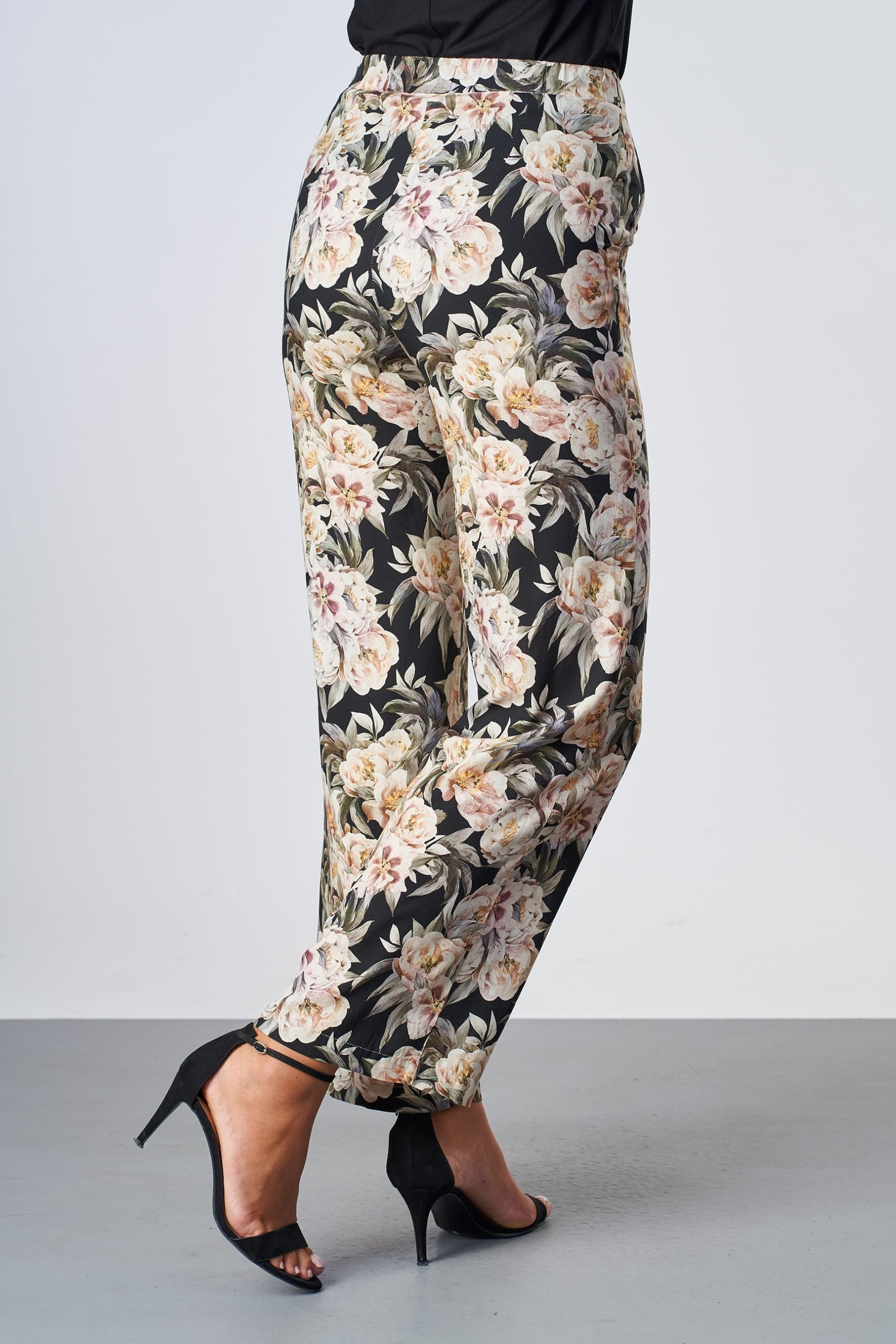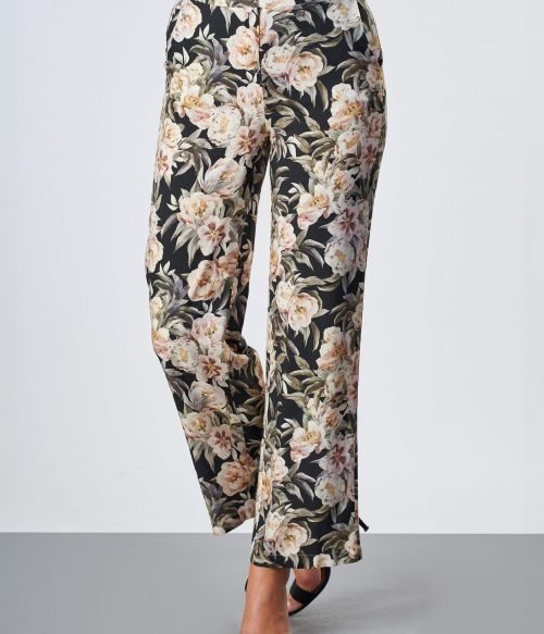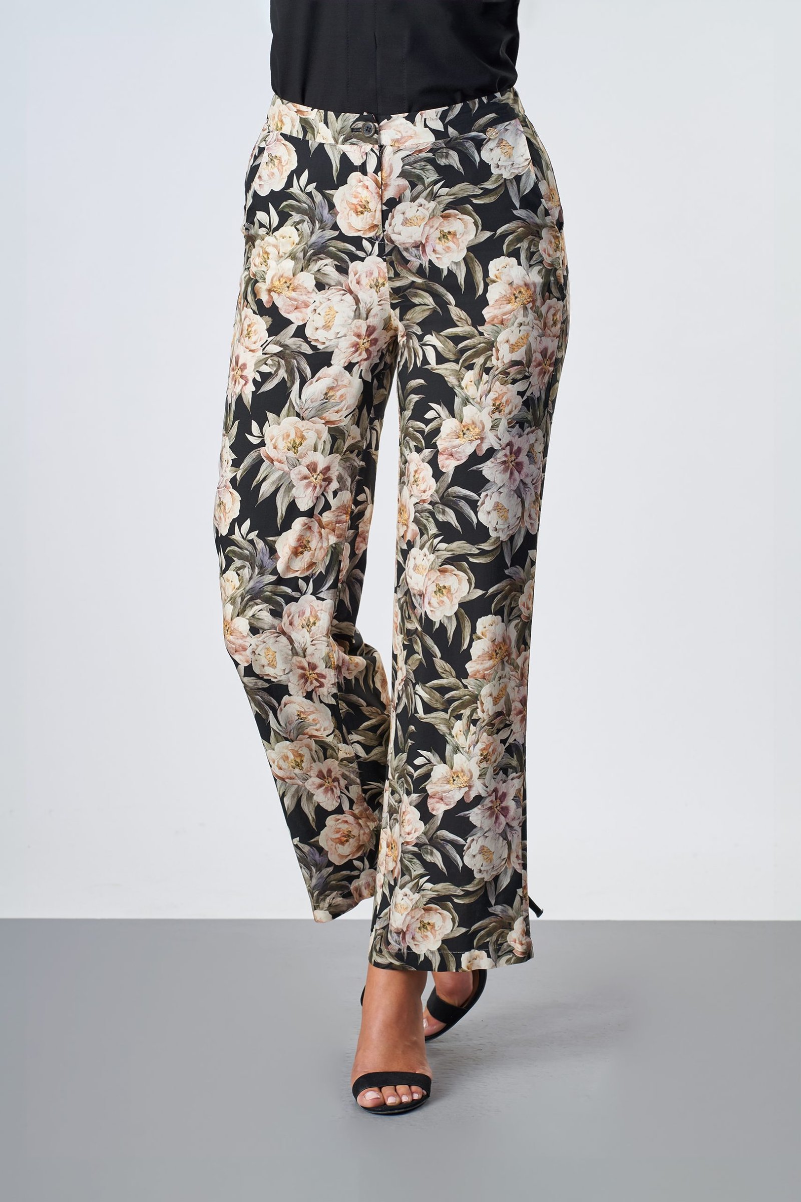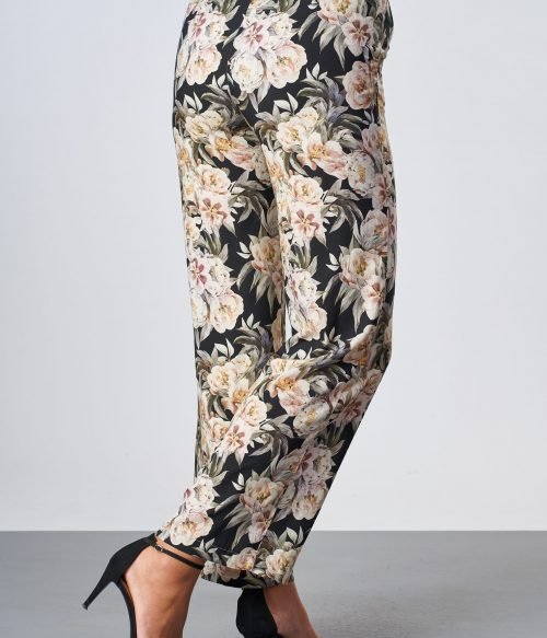 Панталон с прав силует , щампа рози и ластик в задната част на талията.