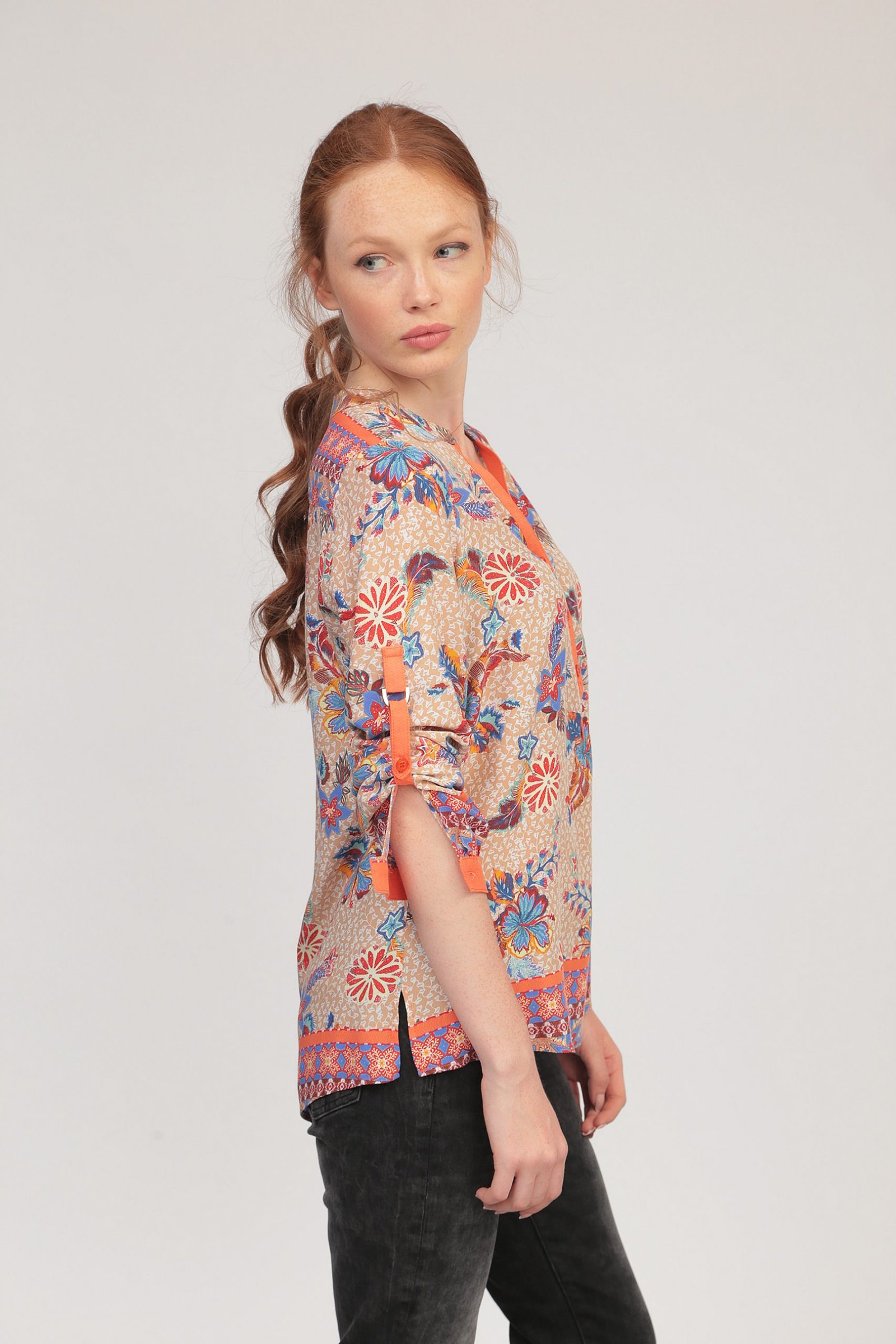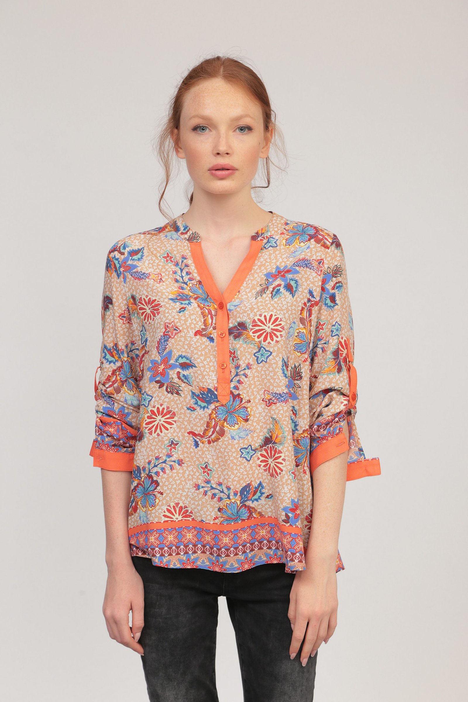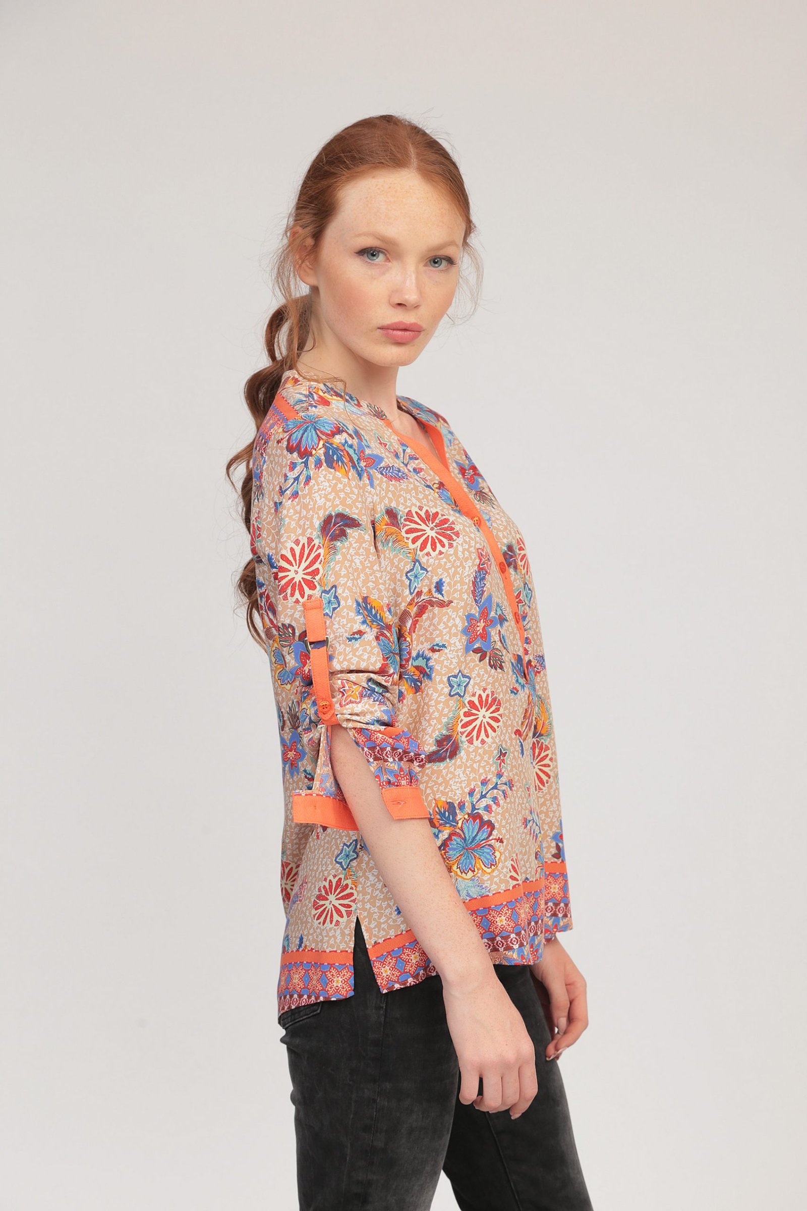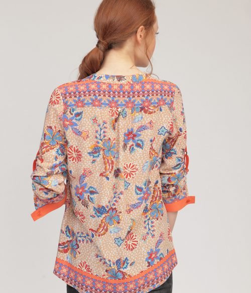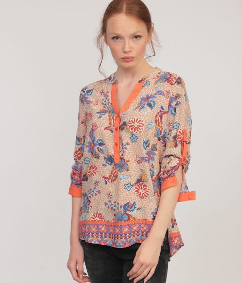 Риза от вискоза с легнало столче яка, оранжева гама.