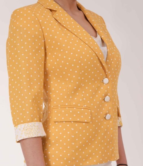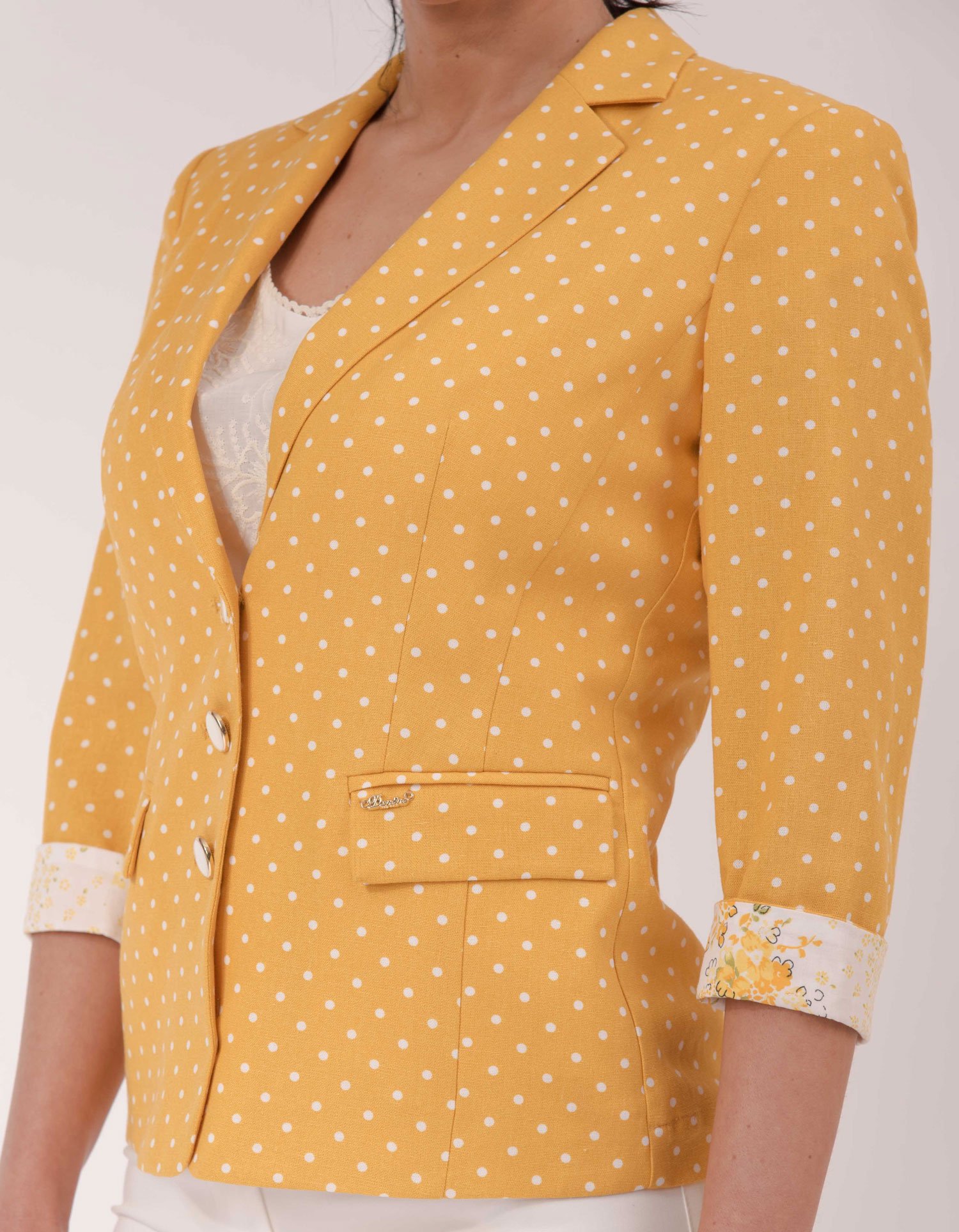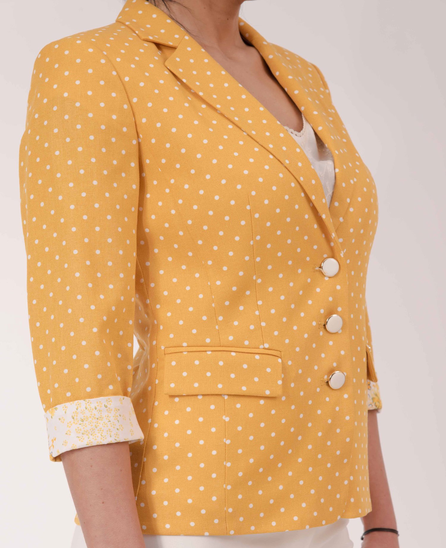 Ленено сако със жълта основа в полка точка с бял десен. Модлеът е в спортно – елагантна визия, налично е и в тъмно син цвят.