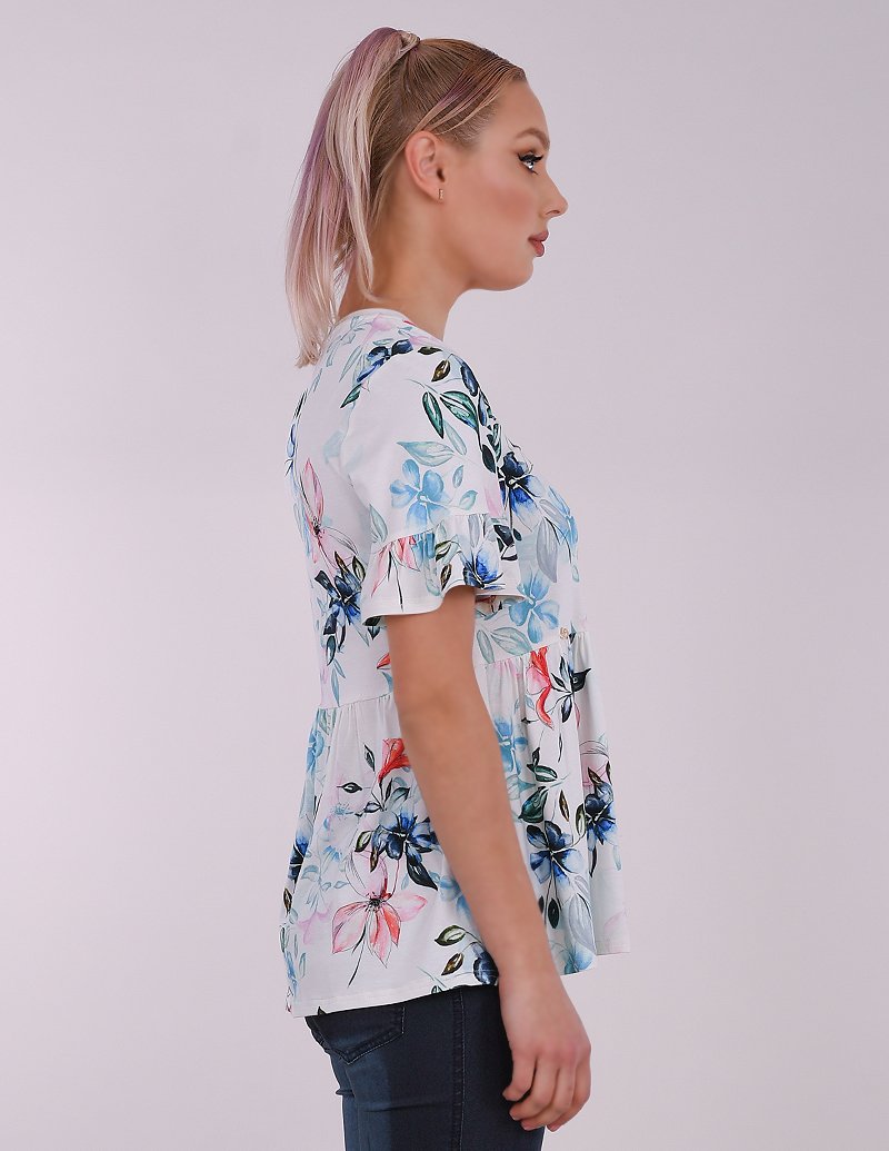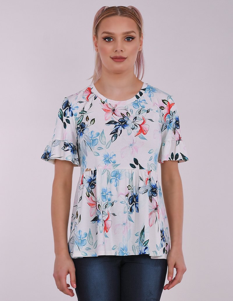 Кокетна туника с нежен флорален десен и симпатична свободна кройка. Mоделът е с овално деколте. Тялото и ръкавите са акцентирани от волани в долната част. Блуза ХЛОЕ е изработена от висок клас вискозно трико, в което Ви гарантираме, че ще се чувствате комфортно през настъпващия сезон. Богатото разнообразие от нюанси позволява различни цветови и стилови комбинации.