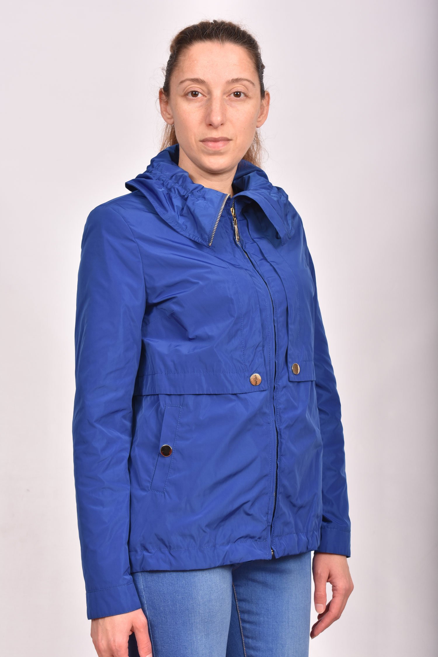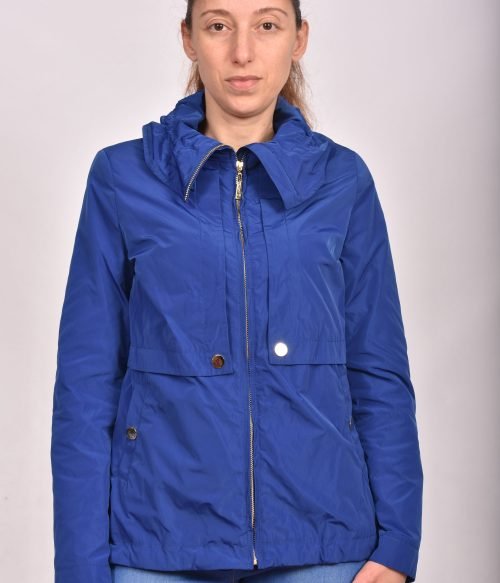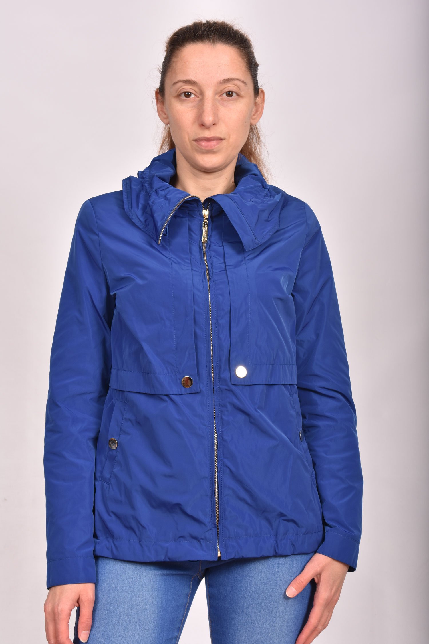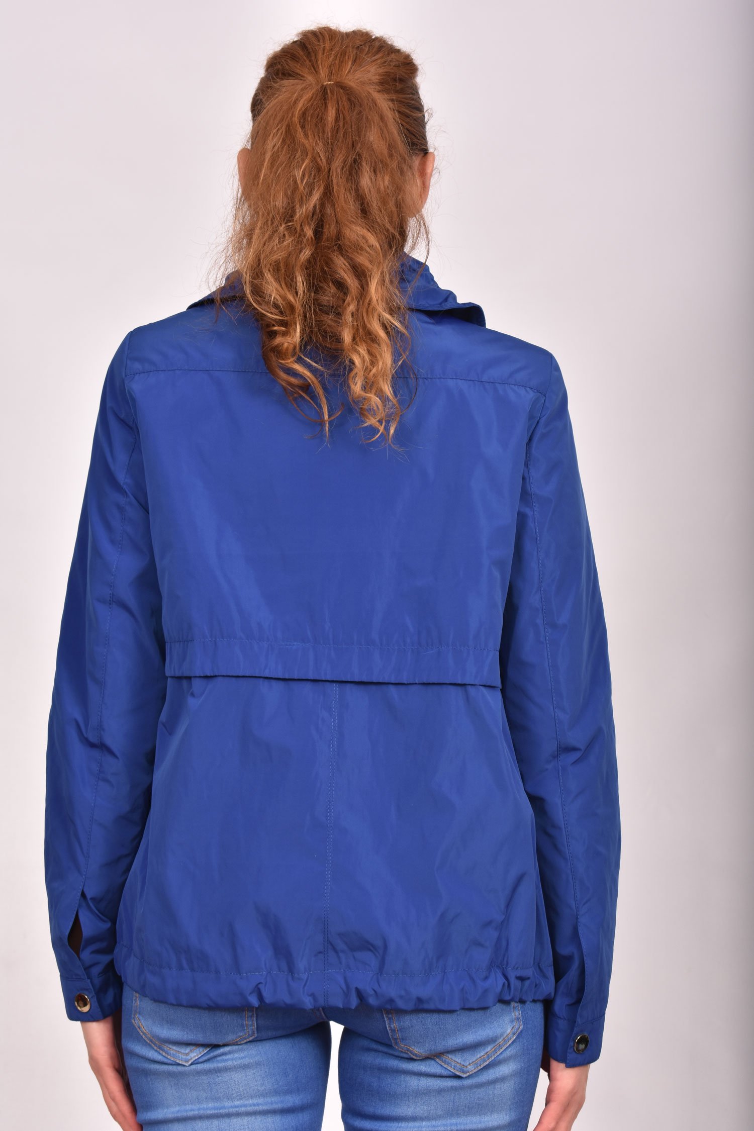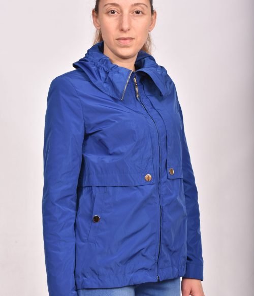 Луксозно спортно елегантно яке, моделът е от промазка, аксесоарите са в цвят злато. Яката е с шнурове в тон, които я регулират и придават желана форма. Цветът на моделът е в кобалтово синьо.
