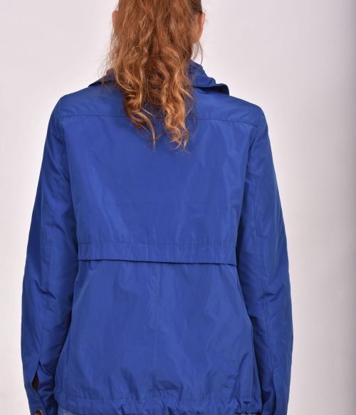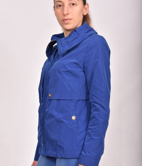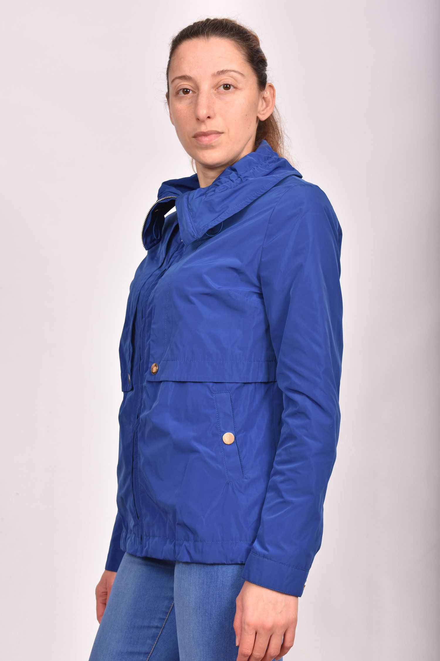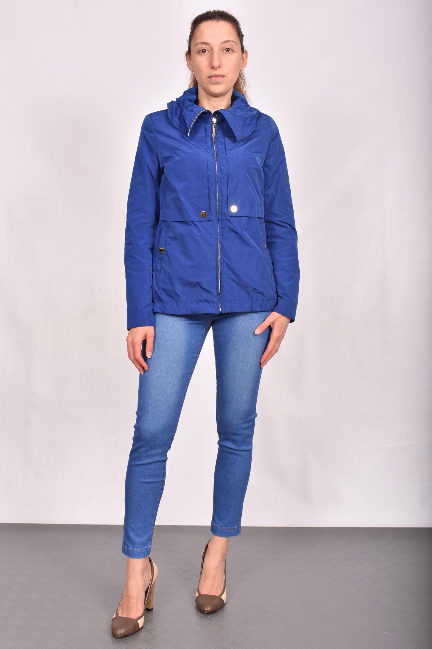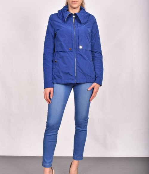 Луксозно спортно елегантно яке, моделът е от промазка, аксесоарите са в цвят злато. Яката е с шнурове в тон, които я регулират и придават желана форма. Цветът на моделът е в кобалтово синьо.